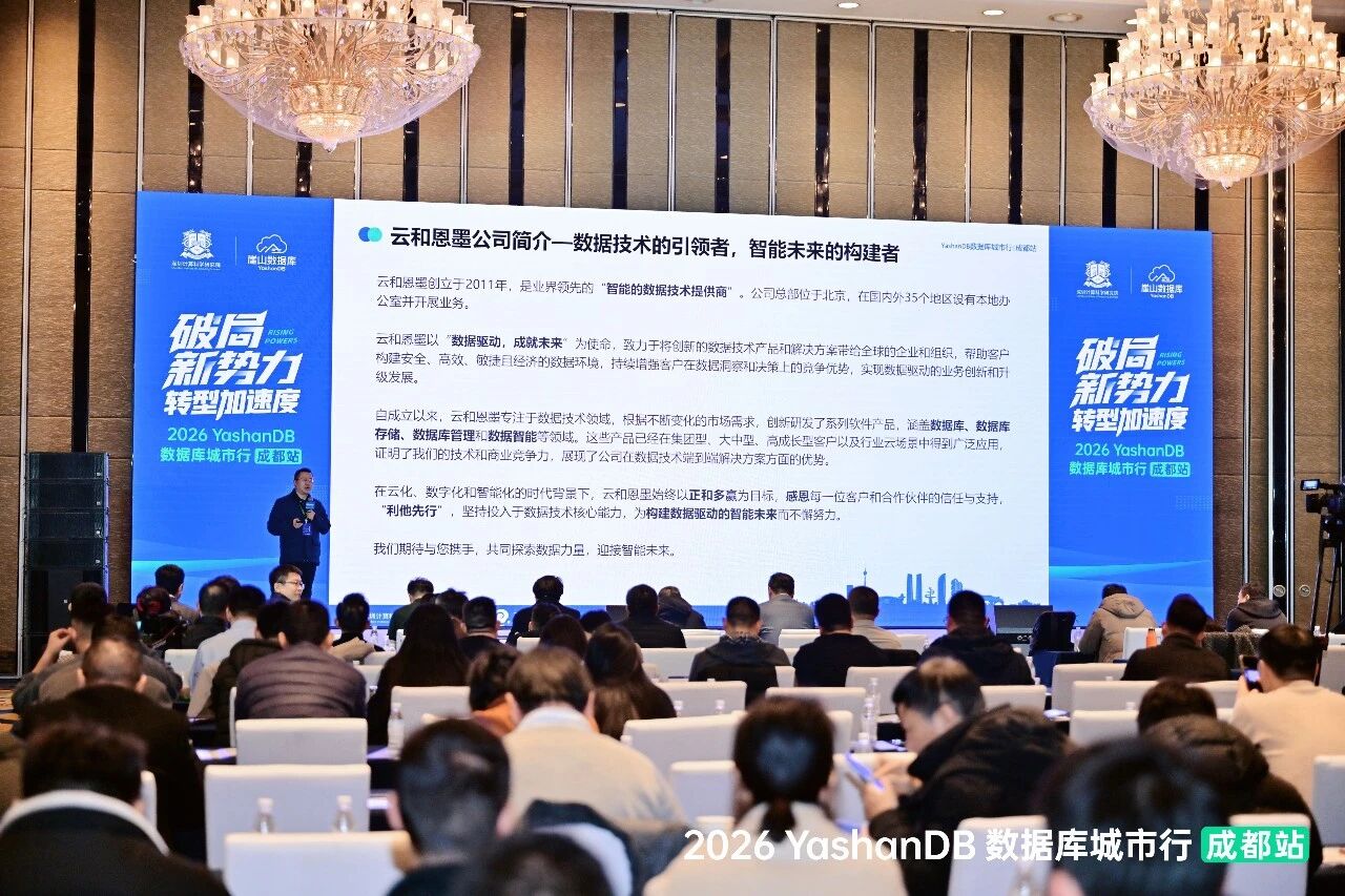 2026年1月13日,由深圳计算科学研究院、崖山科技主办的“2026 YashanDB数据库城市行”新年首站在成都举办。作为国内数据技术领域的引领者,云和恩墨受邀出席此次活动。公司副总经理、数据库和生态产品群总经理熊军作为企业代表,发表主题演讲,正式发布“云和恩墨×YashanDB数据库一体机解决方案”。该方案以全栈信创能力与深度协同创新,为国产数据库替代与生态建设注入强劲动能。