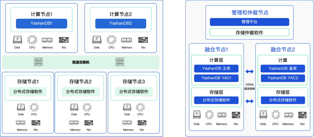 zData X for YashanDB的存算分离架构形态(左)和精简融合架构形态(右)