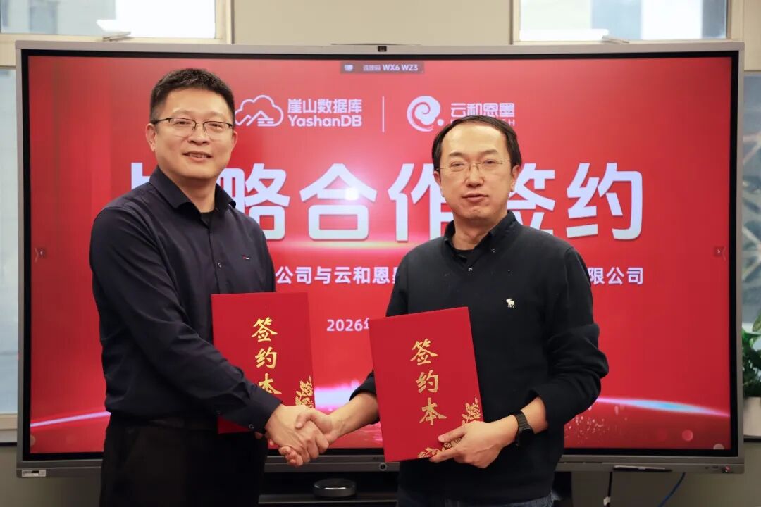 2026年1月28日,云和恩墨(北京)信息技术有限公司与深圳崖山科技有限公司在北京正式签署战略合作协议。云和恩墨创始人兼总经理盖国强、崖山科技CEO陈志标作为双方代表出席签约仪式并共同完成签约。此次战略合作协议的正式签署,标志着双方将在产品研发、市场开拓、客户服务及生态赋能等多维度展开全面且深入的协同,携手为国产数据库产业高质量发展注入强劲动能。陪同出席签约仪式并参加交流的有,崖山科技副总裁王南、交付总监王默、资深数据库专家顾问韩锋,云和恩墨联合创始人杨廷琨、李轶楠。