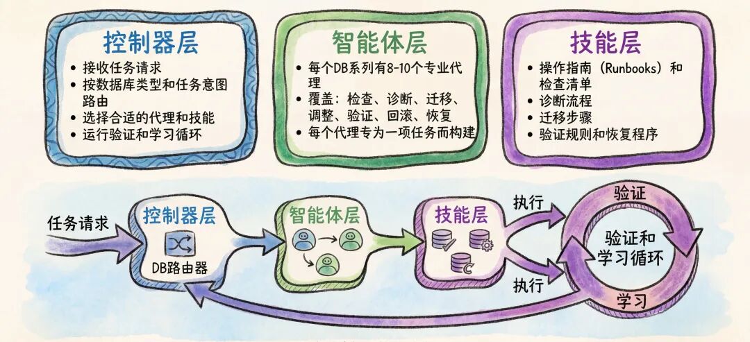 控制器层作为“大脑”,负责任务接收、路由与智能决策;智能体层作为“执行团队”,由各专业智能体组成完成具体运维操作;技能层作为“能力底座”,沉淀了标准化的运行手册、诊断流程、迁移步骤、验证规则与恢复方案,为智能体提供可执行的核心依据。