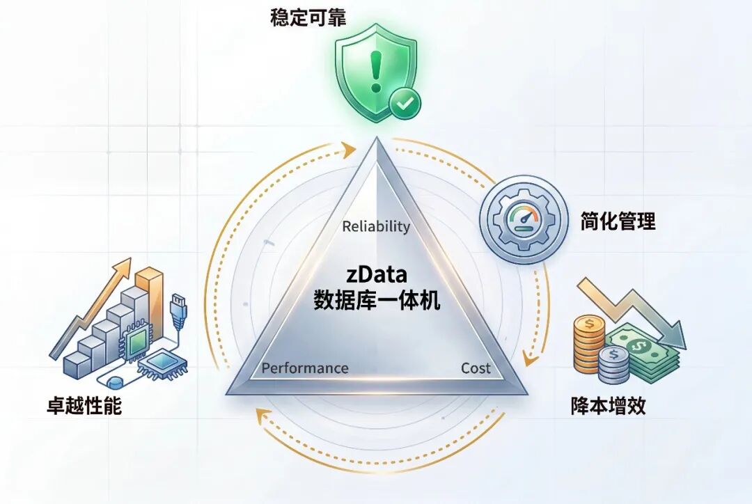 他进一步表示,zData数据库一体机的目标一以贯之,就是从根本上实现以开放硬件支持通用数据库,支持软硬解耦,为用户提供稳定可靠、卓越性能、简化管理的统一“数据库运行平台”,进而实现降本增效。如今,zData通过全维度升级,已经实现了“三角”的有机平衡。