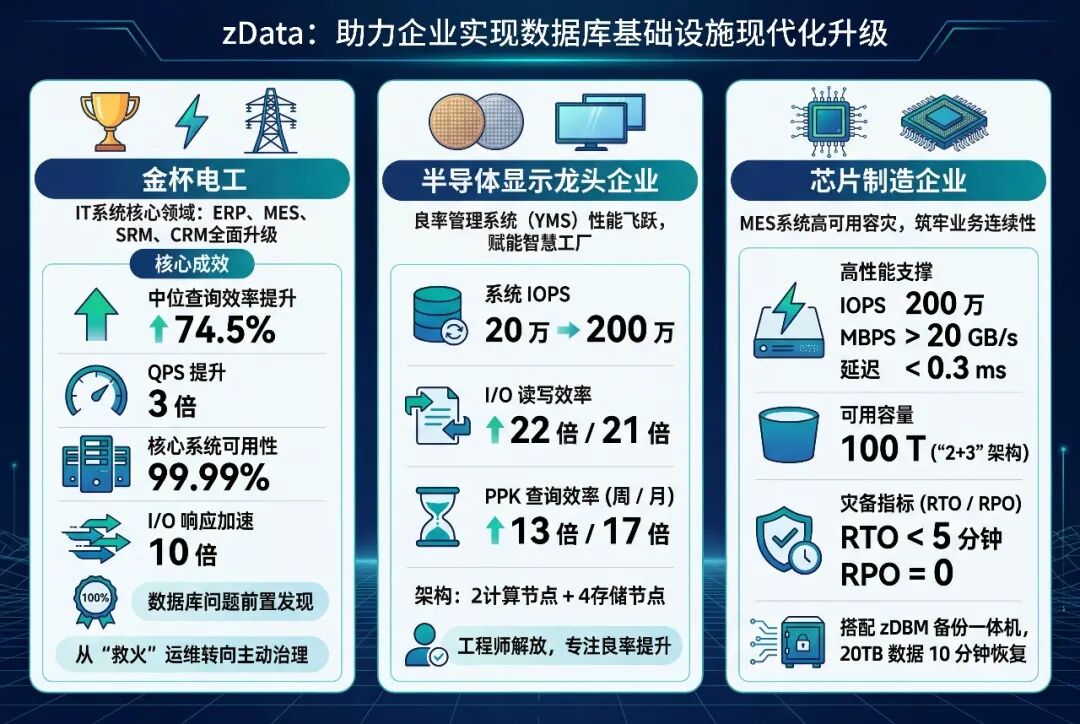金杯电工:IT系统覆盖生产(MES)、供应链(SRM)、销售(CRM)、财务(ERP)等核心领域,却因超融合架构存在性能瓶颈、可用性缺失、运维落后等问题。通过部署数据库智能云管平台(zData + Bethune的组合方案),实现了74.5%的中位查询效率提升,核心系统可用性达到99.99%,100%实现数据库问题前置发现,3倍QPS提升,I/O响应加速10倍。客户IT团队从被动“救火”式运维转向主动治理,全面完成数据基础设施现代化升级。