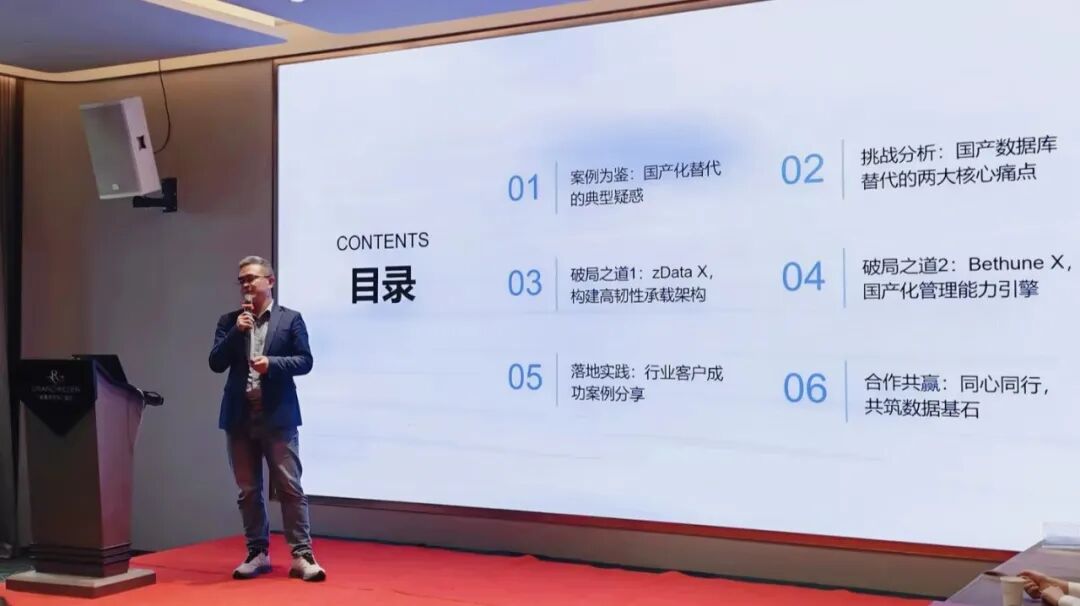 活动现场,云和恩墨中部大区解决方案销售部总经理胡自贵发表了题为《架构的权衡与演进:国产数据库替代中的核心挑战与破局之道》的主题演讲。他结合政务、医疗、制造等多行业实践指出,当前国产数据库替代普遍面临的痛点:性能适配、架构权衡、运维复杂和统一管理缺失。具体来看,集中式与分布式路线如何选择、本地盘与共享存储架构如何取舍、多品牌数据库并存带来的运维挑战,是用户在替代过程中最集中的困惑。