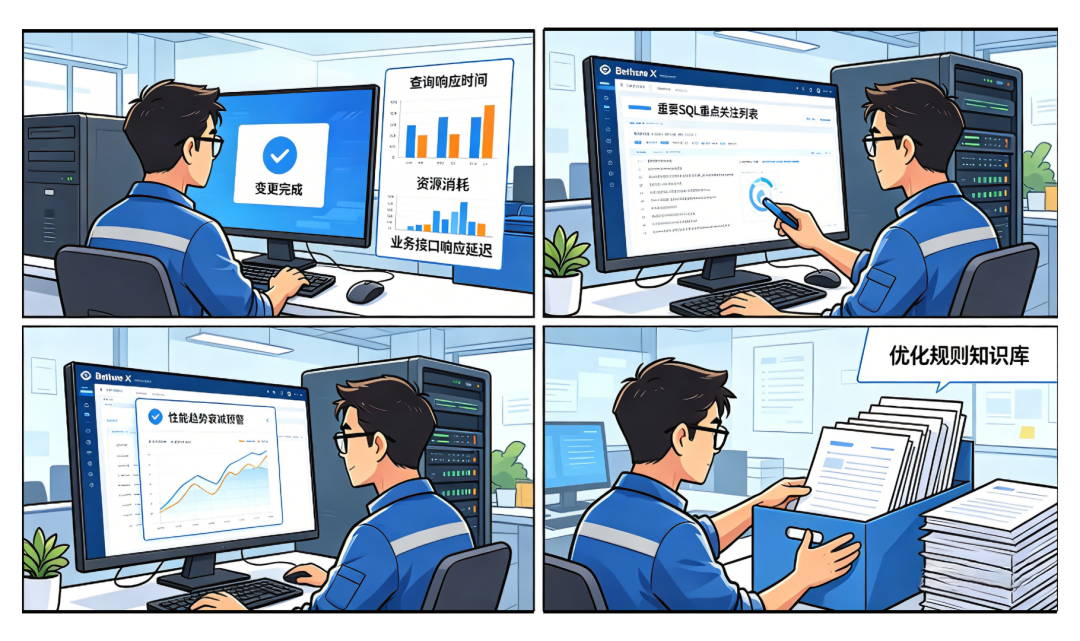 所以我们现在有个不成文的规矩:变更完成后,第一时间对比关键指标——查询响应时间、资源消耗、业务接口的响应延迟等,都要和改之前的数据做对照。