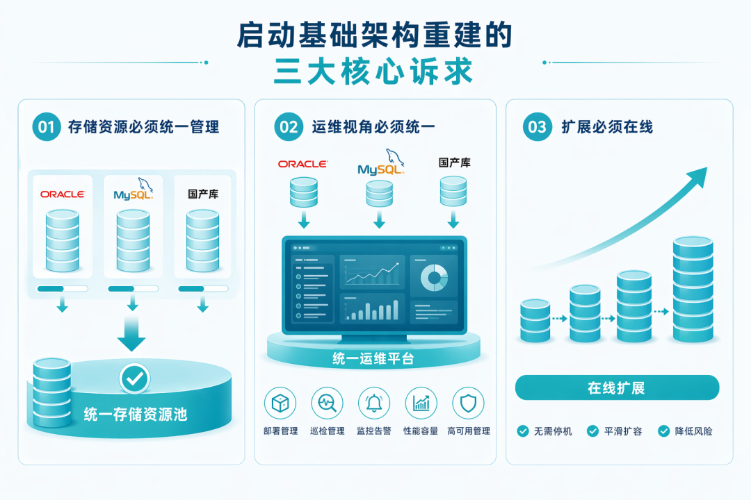 Oracle连着独立的FC-SAN存储;MySQL跑在KVM虚拟机里;国产数据库上线时,按各自厂商的建议划了独立的存储空间。每套数据库的容量预留、快照策略、故障恢复逻辑,各成体系。DBA团队每日巡检,要切换多个平台,同一个告警可能从三个不同的通知系统同时推送——内容还不一样,需要先判断“哪条是真正需要关注的”,再去处理。