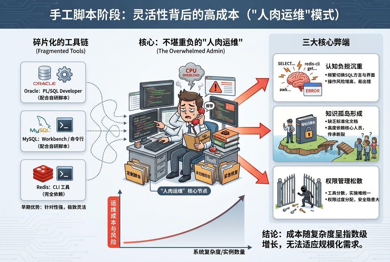 这一阶段可以概括为“人肉运维”模式,其成本随系统复杂度呈指数级增长,无法适应现代企业规模化、多元化的数据库管理需求。