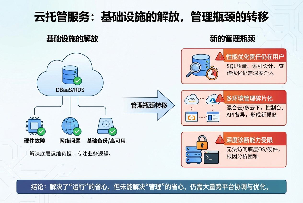 云托管服务的核心价值在于将数据库作为标准化的服务提供,使技术团队能够更专注于业务逻辑而非底层基础设施。然而,这种“省心”有其明显的边界: