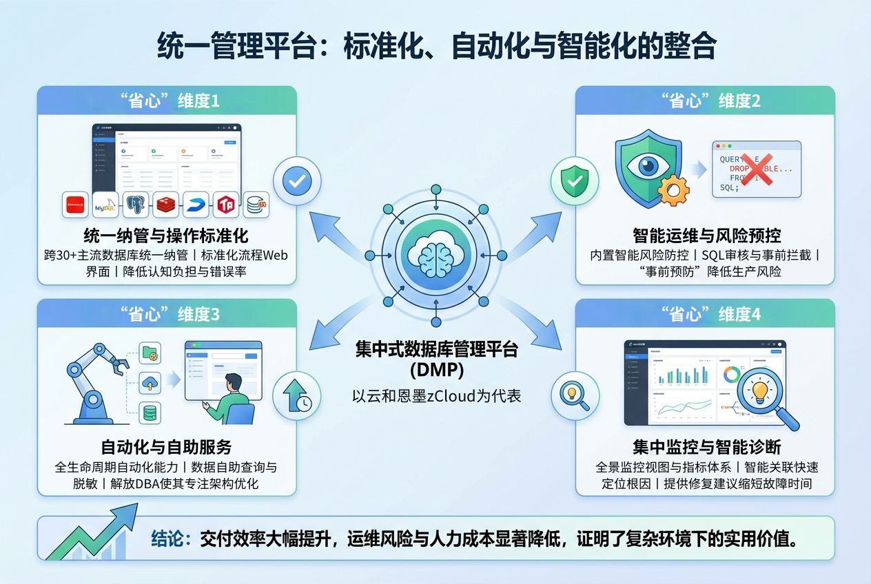 选择统一平台的核心动机“省心”,实质上是对运维效率、风险控制和成本优化的综合追求。这种“省心”不是简单的减少工作量,而是通过技术手段将数据库管理从高度依赖个人经验的“手艺活”,转变为标准化、可复制、可度量的工程实践。