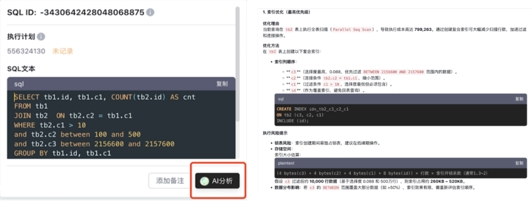 针对低效SQL,平台会自动生成具体的优化方案:索引创建建议会综合考虑字段选择性、表大小、数据分布等因素,避免盲目建索引;SQL改写建议直接提供可执行语句,同时对比不同方案的预期效果,帮助用户选择最优解。对于不熟悉的问题,还能通过智能问答功能查询知识库和同类案例,快速理解优化逻辑,不仅让初级DBA能完成专业级优化,还能大幅缩短优化周期。