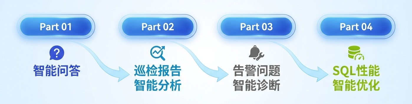 数据库监控巡检平台Bethune X的智能能力,正是从这一断点出发,通过引入AI技术,对数据库监控的能力边界进行了系统性扩展,形成“先解惑,再分析、诊断,最终落到优化执行上”的完整闭环。它并不是简单地“加了一个大模型”,而是把LLM、RAG、知识库跟实时监控数据揉在一起,实现智能问答→智能分析→智能诊断→智能优化的层层递进,构建了一条智能运维路径。
