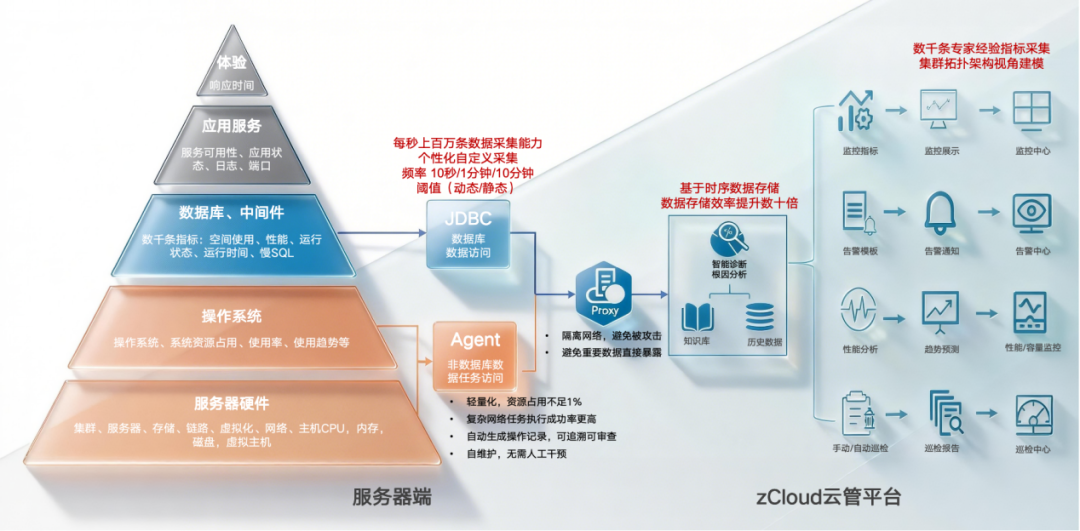 统一监控体系是zCloud的“千里眼”与“顺风耳”。平台采用Agent + JDBC + Proxy三重采集机制,覆盖服务器硬件、操作系统、数据库、中间件、应用服务等全栈指标,采集频率支持10秒(高频)到1天(低频)的灵活配置,可捕获数千条关键指标。基于Prometheus时序数据存储,数据存储效率提升数十倍,能实时呈现CPU使用率、会话数、慢SQL等核心数据。监控大屏直观展示数据库健康状态、资源占用趋势和告警信息,任一实例的性能波动都能被即时感知,正如“运筹帷幄之中,决胜千里之外”,让运维人员无需亲临现场,便能掌控全局。
