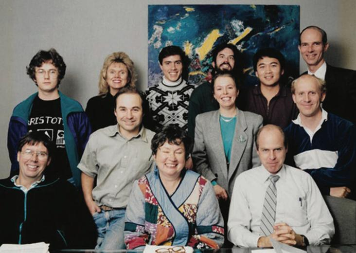 在上一篇《从Britton-Lee到zData,专用硬件和通用硬件之抉择》中,我们提到了数据库领域的先驱之一保拉·霍索恩(Paula Hawthorn)。有朋友对这对伉俪的携手经历很感兴趣,我在迈克尔·斯通布雷克(Michael Stonebraker)的书中找到了一张照片,这张照片是Illustra团队的合影(如图1所示)。图中,前排中间的是保拉·霍索恩,中排左一为迈克·乌贝尔(Michael Ubell)。这个团队中每个人都有一个绰号,霍索恩的外号是“老妈(Mom)”、乌贝尔的外号是“小个子(Short One)”。她们妇夫二人在Britton-Lee之后,追随斯通布雷克的第二次创业历程,共同发起了Illustra,致力于将Postgres商业化。当然,照片前排左一正是大家所熟知的Ingres传奇的缔造者迈克尔·斯通布雷克,他也是数据库领域第四位图灵奖得主。