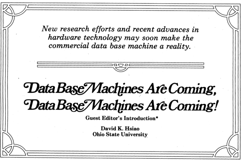 David K. Hsiao, "Data Base Machines are Coming, Data Base Machines are Coming!", ACM SIGMOD Record, Vol. 9, No. 4, March 1979.
