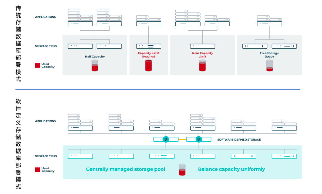 在软件定义存储的数据库部署模式中,传统的“数据库服务器+专用存储阵列”架构被彻底重构: