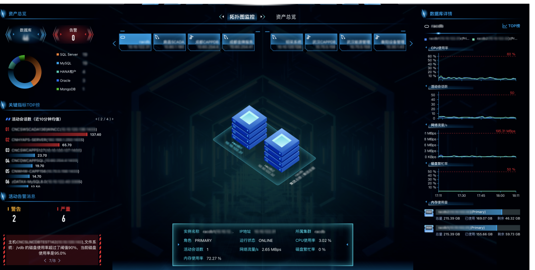 2025年10月,具备多元数据库承载能力的新一代zData X在金杯电工正式上线,帮助这家传统制造业巨头将其生产制造(MES)、供应链(SRM)、销售(CRM)、财务(ERP)等核心系统整合到新平台之上。系统完成重构迁移之后,数据库I/O性能较原架构提升了10倍,并且从超融合平台回收了148核CPU、17.7TB存储,让用户的资源得以充分利用,整体IT运行成本得到大幅优化。zData X提供的可视化智能运维平台更让数据库管理实现了现代化(如图7所示)。
