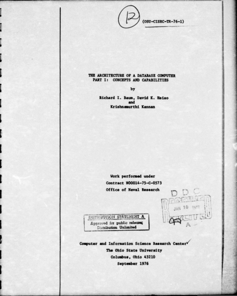 David K. Hsiao, "The Architecture of a Database Computer" (three-volume technical report), The Ohio State University, OSU-CISRC-TR-76-1, OSU-CISRC-TR-76-2, OSU-CISRC-TR-76-3, September-December 1976. 收录于Hsiao (ed.), "Collected Readings on a Database Computer (DBC)," 1979.