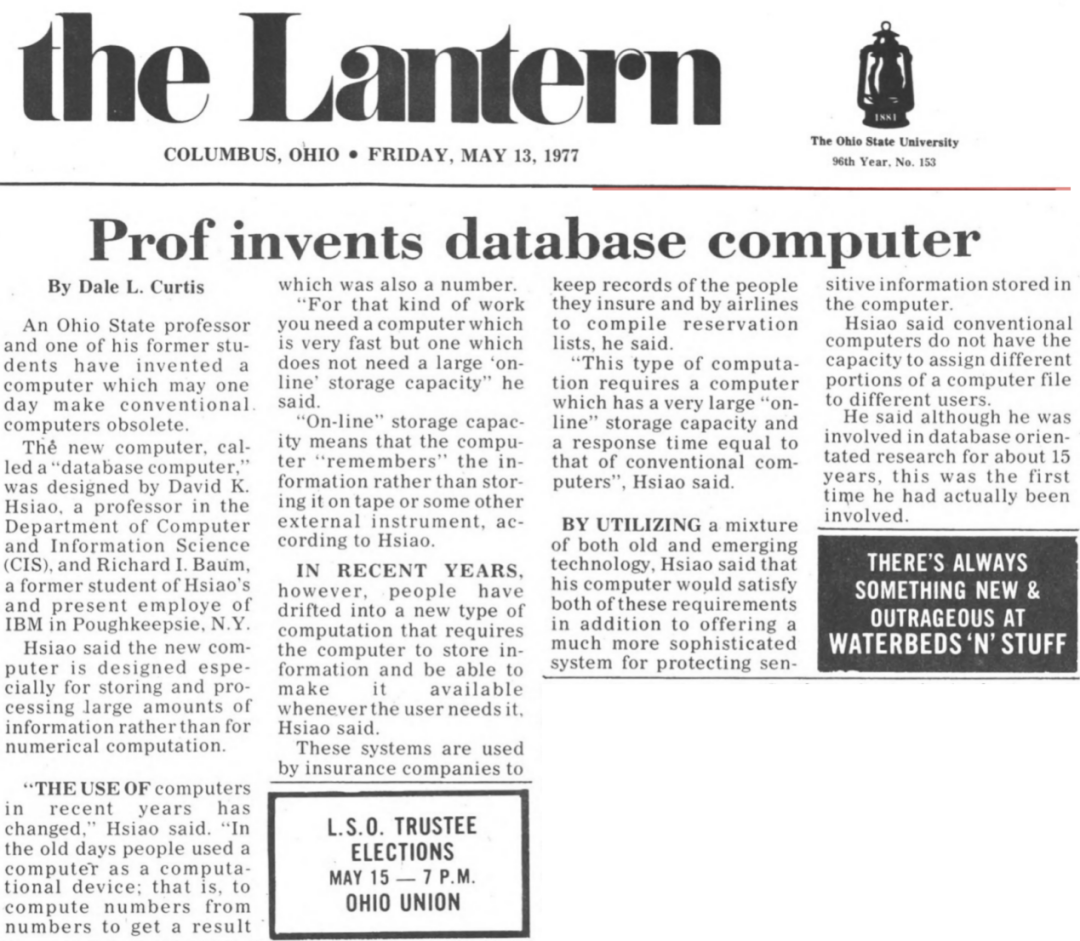 在1977年的VLDB大会上,萧开美发表了"Database Machine Architecture in the Context of Information Technology Evolution",进一步阐述了从数据库机到数据库计算机的历史必然性。与此同时,《俄亥俄州立大学校报》也在1977年5月报道了萧开美的工作,标题为《教授发明数据库计算机》(Prof invents database computer),称这一发明“将有一天让传统计算机走向过时”。这种夸张的预言虽然并未完全成真,但确实折射出彼时学术界对数据库专用硬件的强烈期待。图5是《俄亥俄州立大学校报》的报道全文,其主要内容如下: