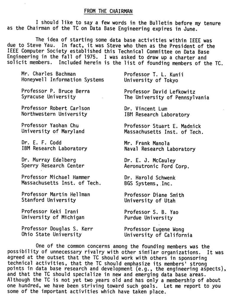 1977年6月,萧开美卸任TC/DBE主席前,在"Data Base Engineering"上发表了回顾致辞(如图6所示)。他说,大家在初始阶段即达成共识:“技术委员会应与其他组织合作主办技术活动,应发挥成员在数据库研究与开发方面的优势(例如工程应用层面),并专注于新兴数据库领域。”