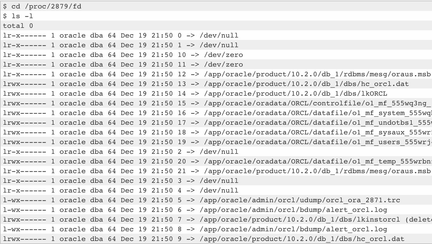 4. dbwr 会打开所有数据文件的句柄。在 proc 目录中可以查到,目录名是进程 PID,fd 表示文件描述符。