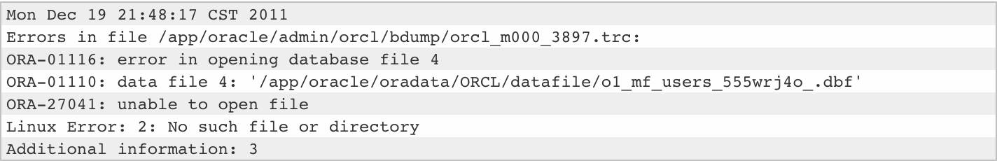 注意其中“/app/oracle/oradata/ORCL/datafile/o1_mf_users_555wrj4o_.dbf (deleted)”字样,表示该文件已经被删除,如果是 Solaris 操作系统,ls 命令不会有如此清晰的显示,为了在 Solaris 系统中确认哪个句柄对应哪个文件,则需要使用 lsof 程序。