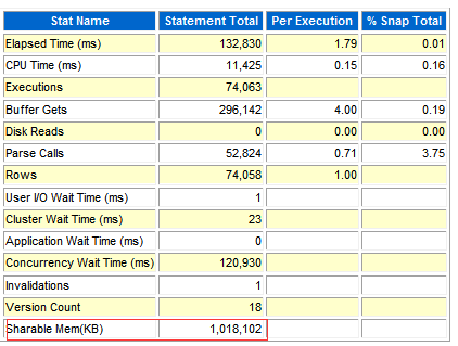 对比上周同一天的AWR,这个SQL执行的次数差不多,大概半小时7万次左右,但在23号的AWR中,该SQL在Order by Version Count出现,Version Count为76(实际上在v$sql中发现有2万个 不同CHILD_ADDRESS出现),说明该SQL产生过2万个子游标。这里也看到其他SQL High Version,但由于其他SQL执行没有0pjnn575vchbg频繁,并不引发library cache lock等待。