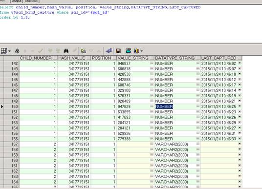 这样排除了ACS BUG引起后。观察V$SQL_SHARED_CURSOR中大量BIND_MISMATCH,但BIND_MISMATCH根据Oracle的规则,只有5,6种不同的可能性,不至于产生2万个子游标。进一不查看V$SQL_BIND_CAPTURE发现绑定变量值中,出现异常的varchar2类型,且值为空。结合Bug 8198150 - High Versioncount with bind_mismatch with passing null value to bind (文档 ID 8198150.8),推断该SQL绑定变量时输入了空值,导致产生大量子游标。在V$SQL_BIND_CAPTURE视图中表现为VARCHAR2类型(varchar2为Oracle默认类型,null值无类型则为Oracle默认类型)。