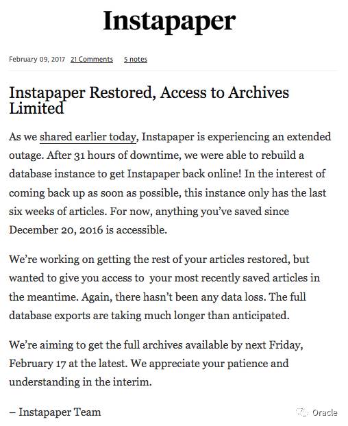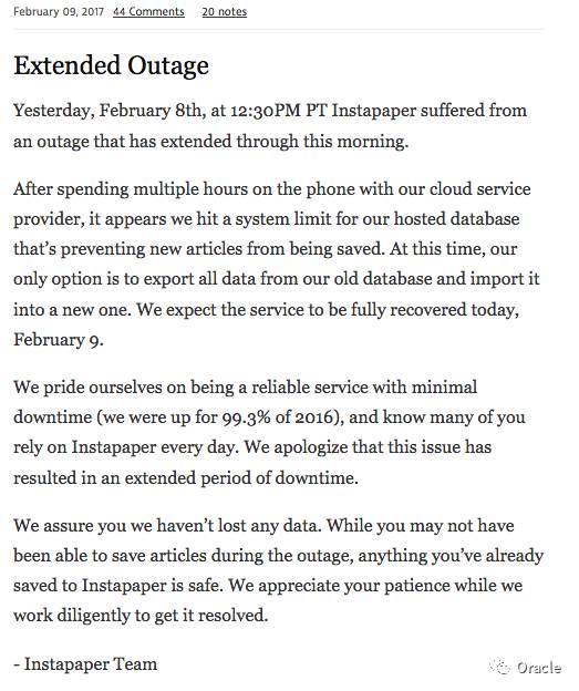 Instapaper 还说:我们位2016年99.3%的可用性自豪,我们确保用户的数据没有丢失。但是恢复还需要时间。