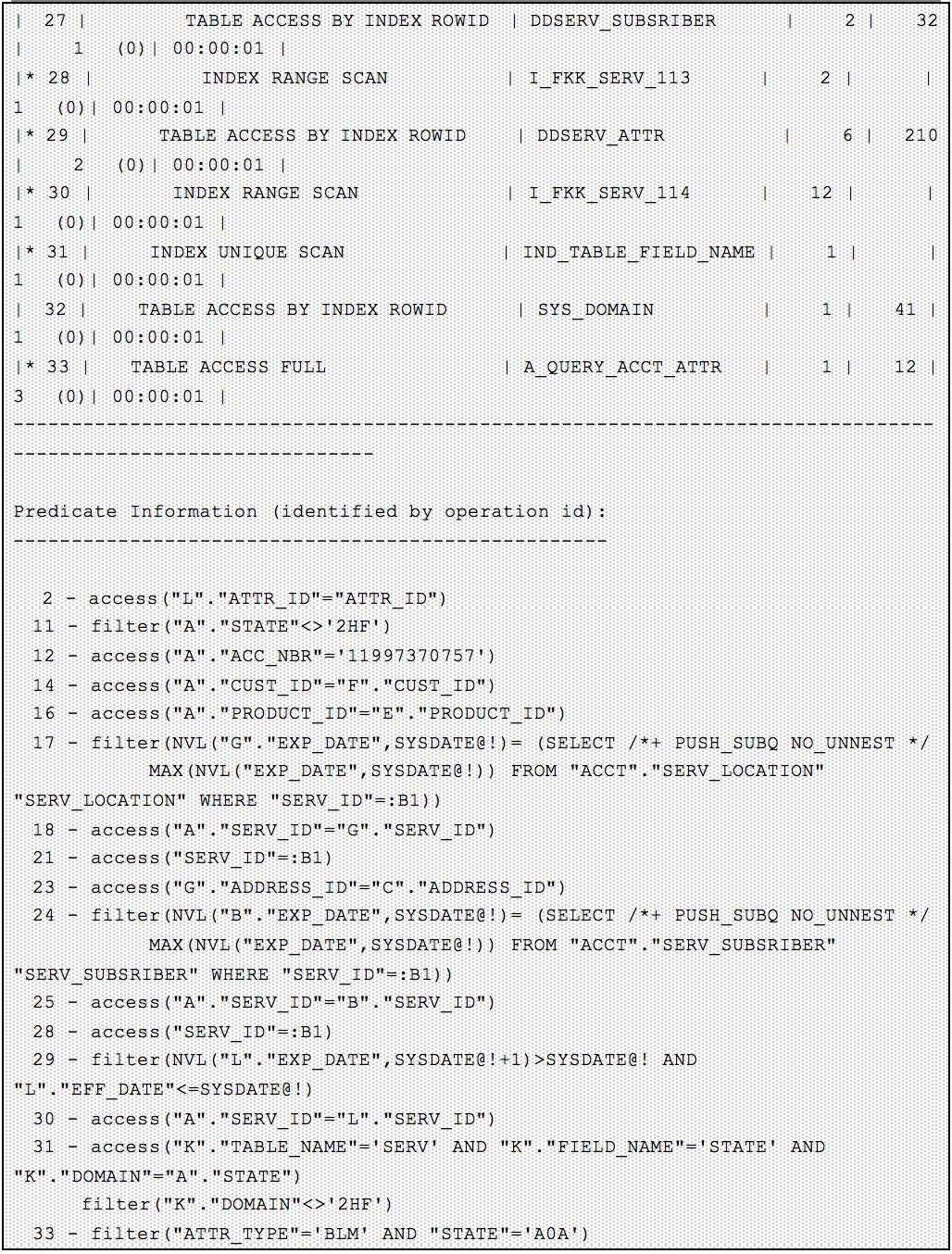 可以看出该 SQL 涉及的2个标量子查询中,对于表 DDSERV_SUBSRIBER 涉及的标量子查询未发生子查询展开的情况,其对应于 id=3 这个 filter,且该 filter 是对 id=4 和 id=33 的这2个结果集进行一个类似嵌套循环的操作;
